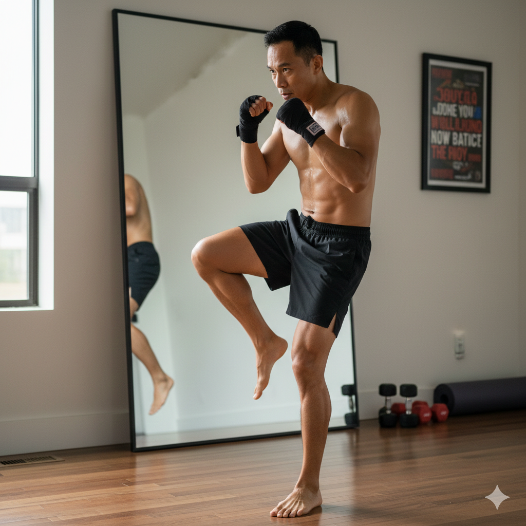 - Allows for self-correction – Training in front of a mirror helps identify flaws in form, footwork, and guard positioning.